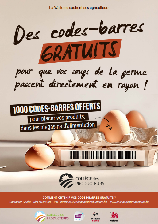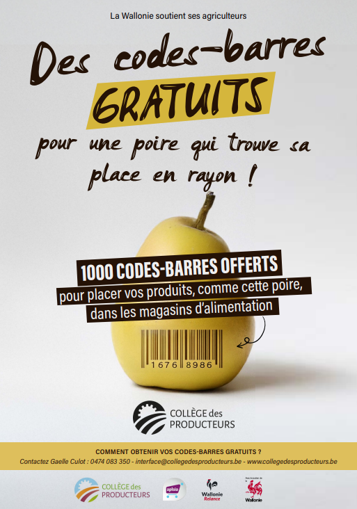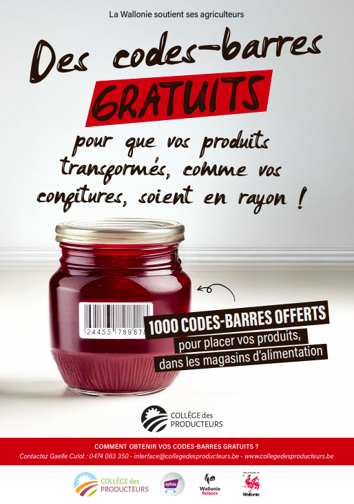 Vous êtes producteur ou artisan-transformateur et souhaitez voir vos produits référencés plus facilement en magasin ? Grâce au Plan de Relance de la Wallonie, 1 000 codes-barres (type EAN-13) sont désormais mis gratuitement à disposition des professionnels du secteur alimentaire wallon.