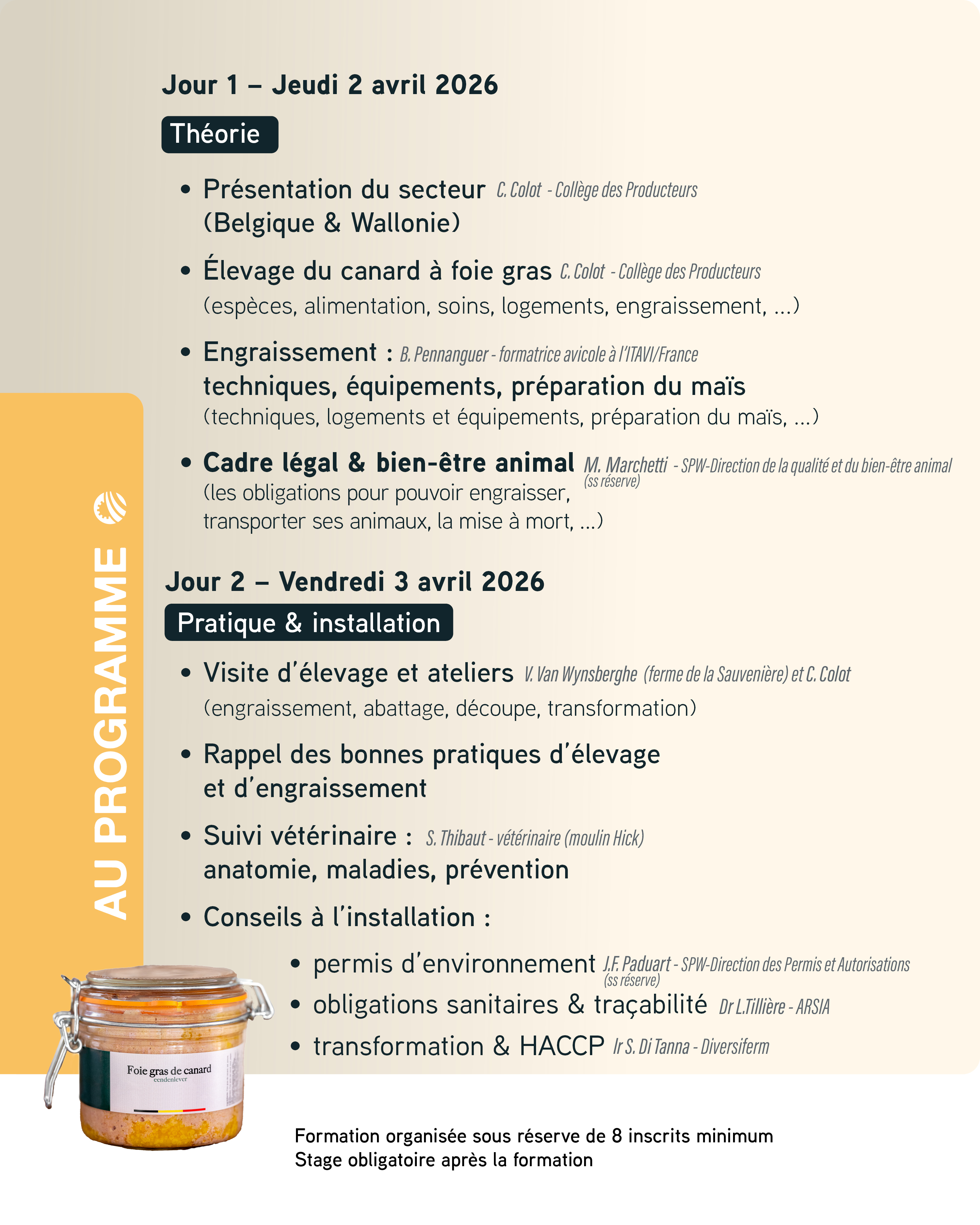 Les 2 et 3 avril, le Collège des Producteurs organise une formation officielle et agréée par le Service public de Wallonie en production de foie gras et engraissement des canards. Cette formation obligatoire constitue une étape essentielle pour accéder légalement à cette production de niche, à forte valeur ajoutée, souvent développée en circuits courts.