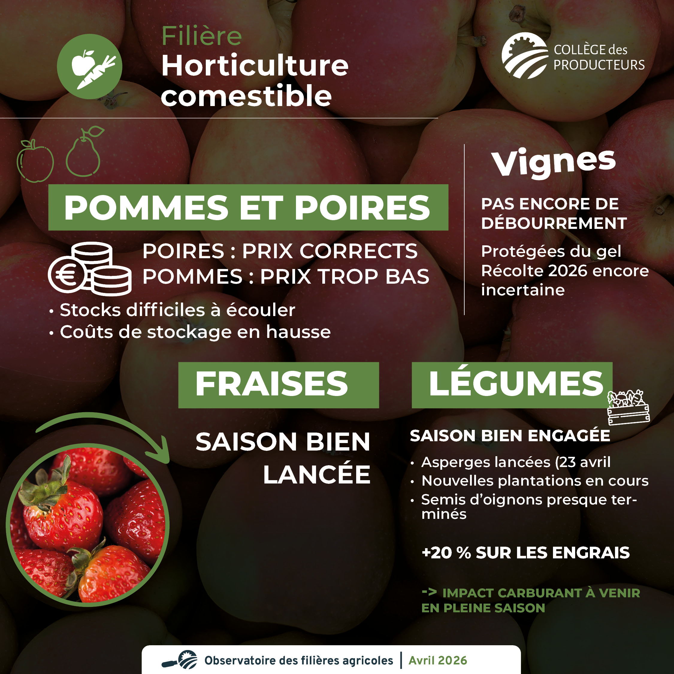 - Pommes et poires : les prix en poires sont corrects, tandis que les prix en pommes sont toujours trop bas. Les producteurs peinent à écouler leurs stocks, tandis que les coûts énergétiques liés au stockage menacent d'augmenter.