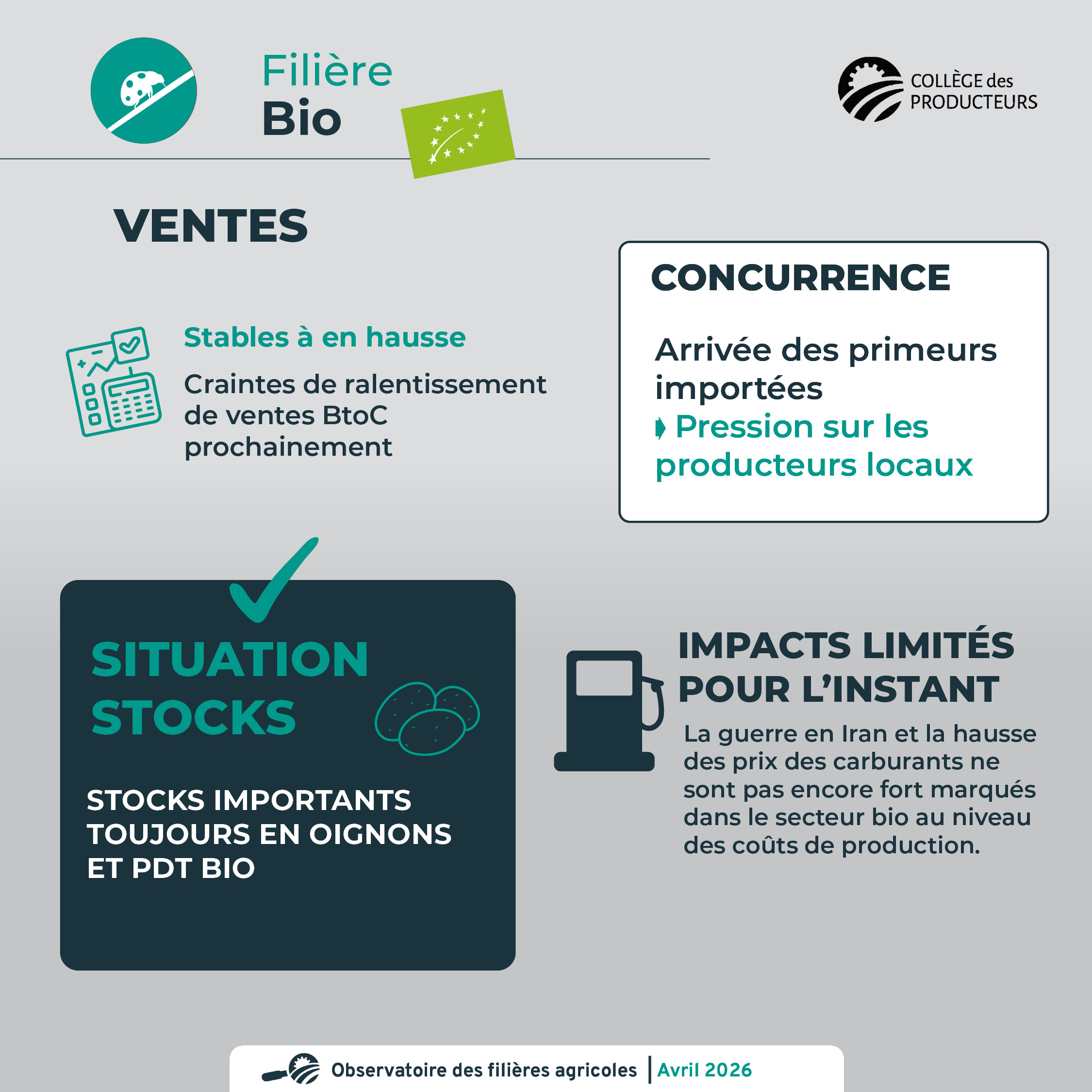 - Les ventes en magasins spécialisés ou sur les marchés sont stables ou en progression. Il y des craintes de voir un ralentissement des ventes BtoC prochainement.