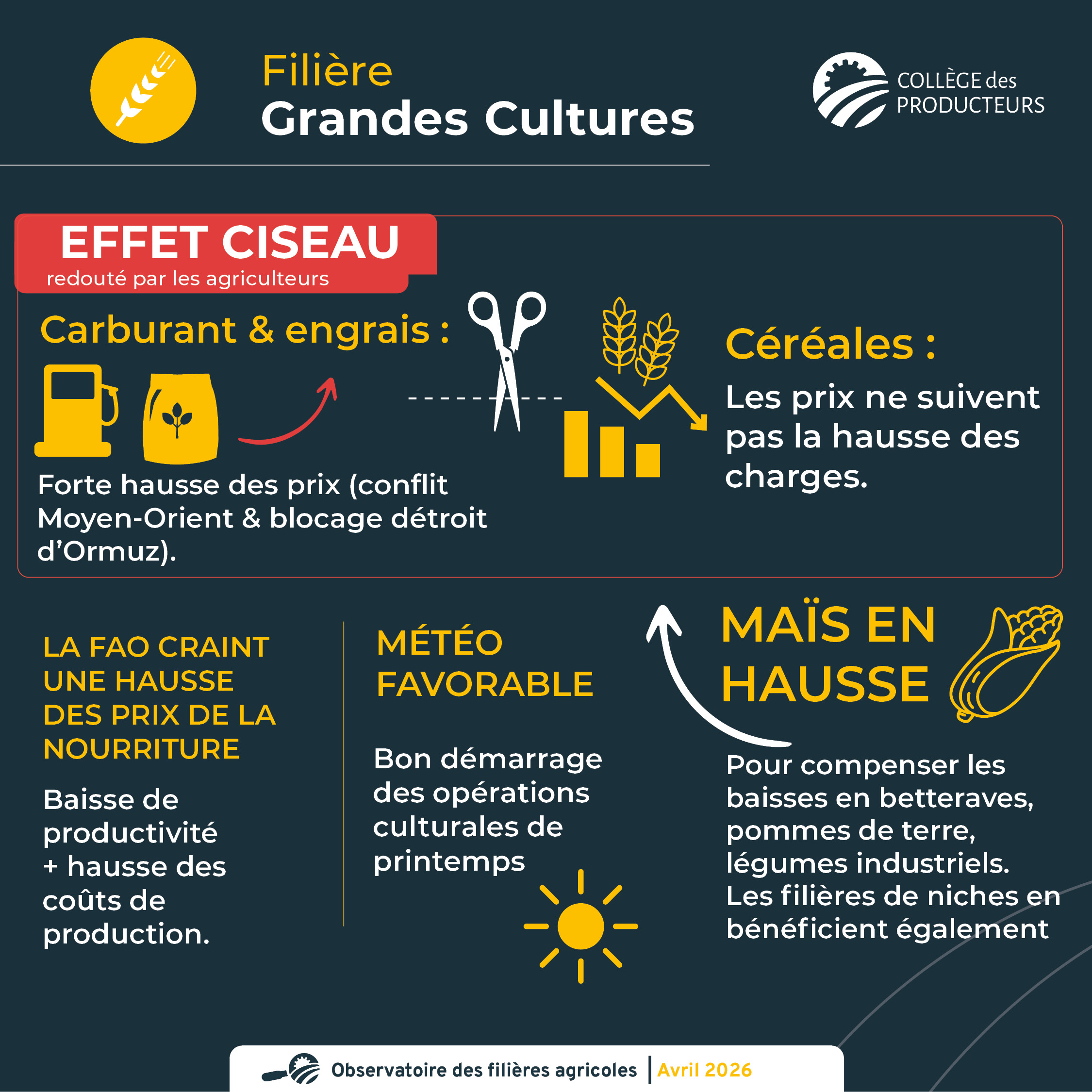 - La guerre au Moyen-Orient et la perturbation du trafic maritime du détroit d'Ormuz continuent d'impacter fortement les prix du carburant et des engrais. Le prix des céréales ne suit toujours pas ; un effet ciseau important continue d'être redouté par les agriculteurs.