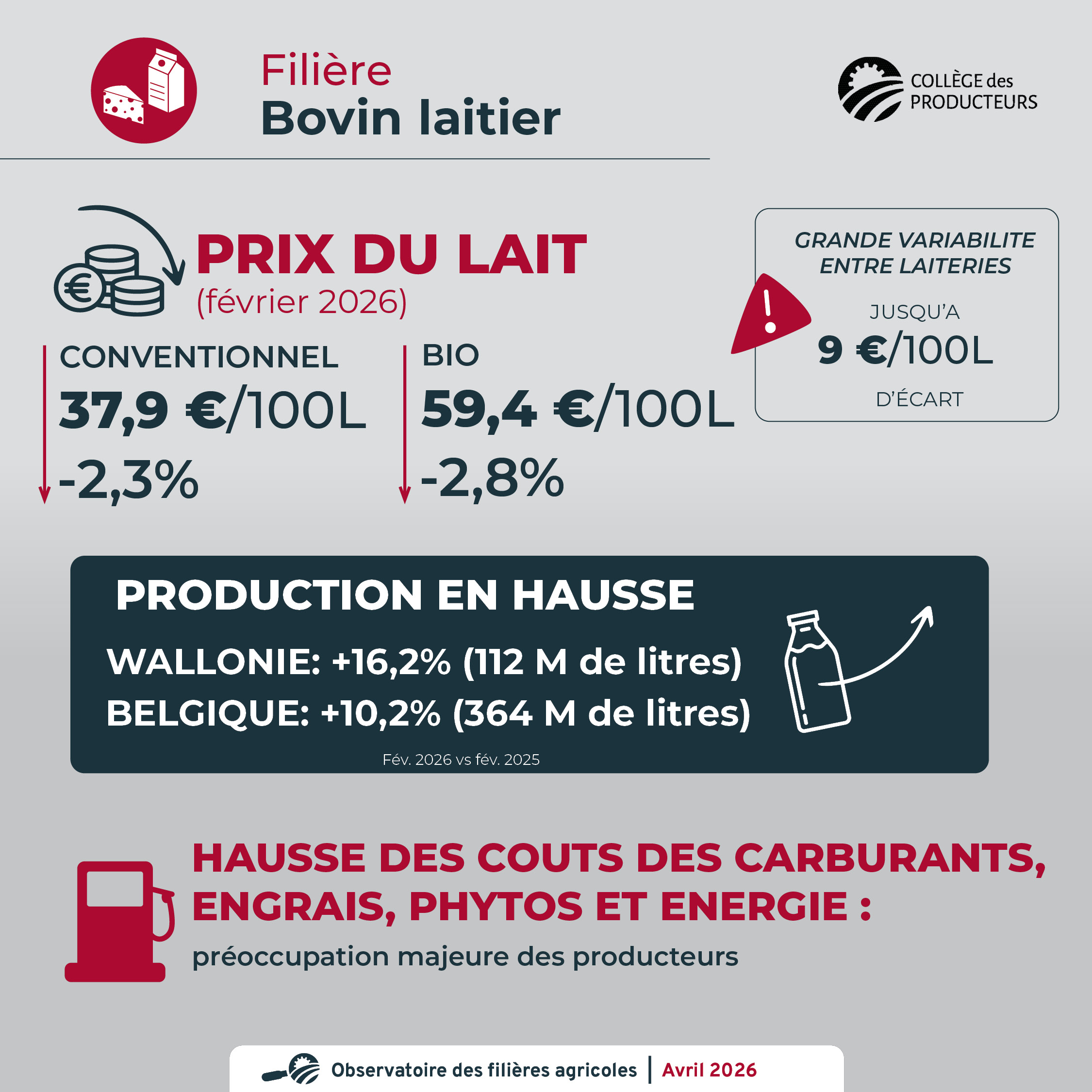 - La production laitière wallonne de février 2026 a augmenté de +16,2 % par rapport à celle de février 2025, atteignant 112 millions de litres. La production laitière belge a augmenté de +10,2 % en février 2026 par rapport à février 2025, atteignant 364 millions de litres.