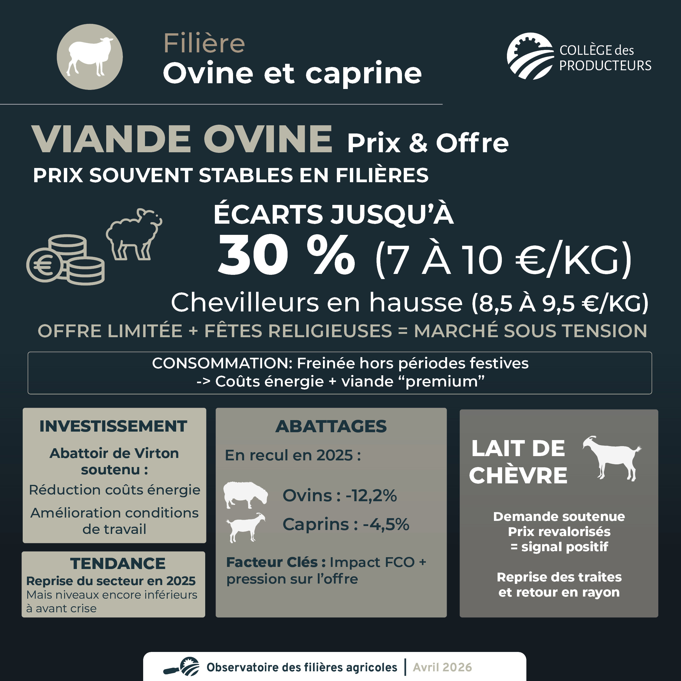 - Les abattages ont reculé en 2025 de 12,2 % en ovins et de 4,5 % en caprins. L'impact de la FCO se fait également ressentir sur les volumes abattus. La pression sur l'offre liée aux fêtes religieuses, ainsi que l'abattage privé, demeurent les principaux facteurs de variation des volumes.
